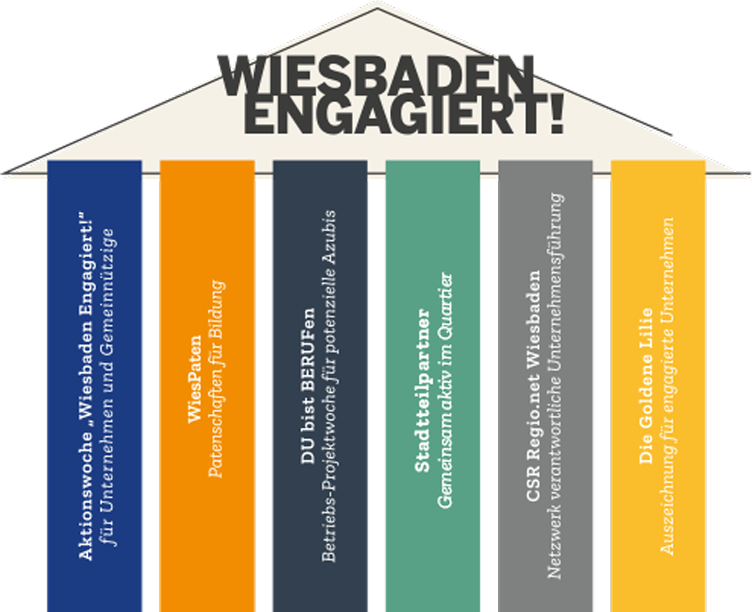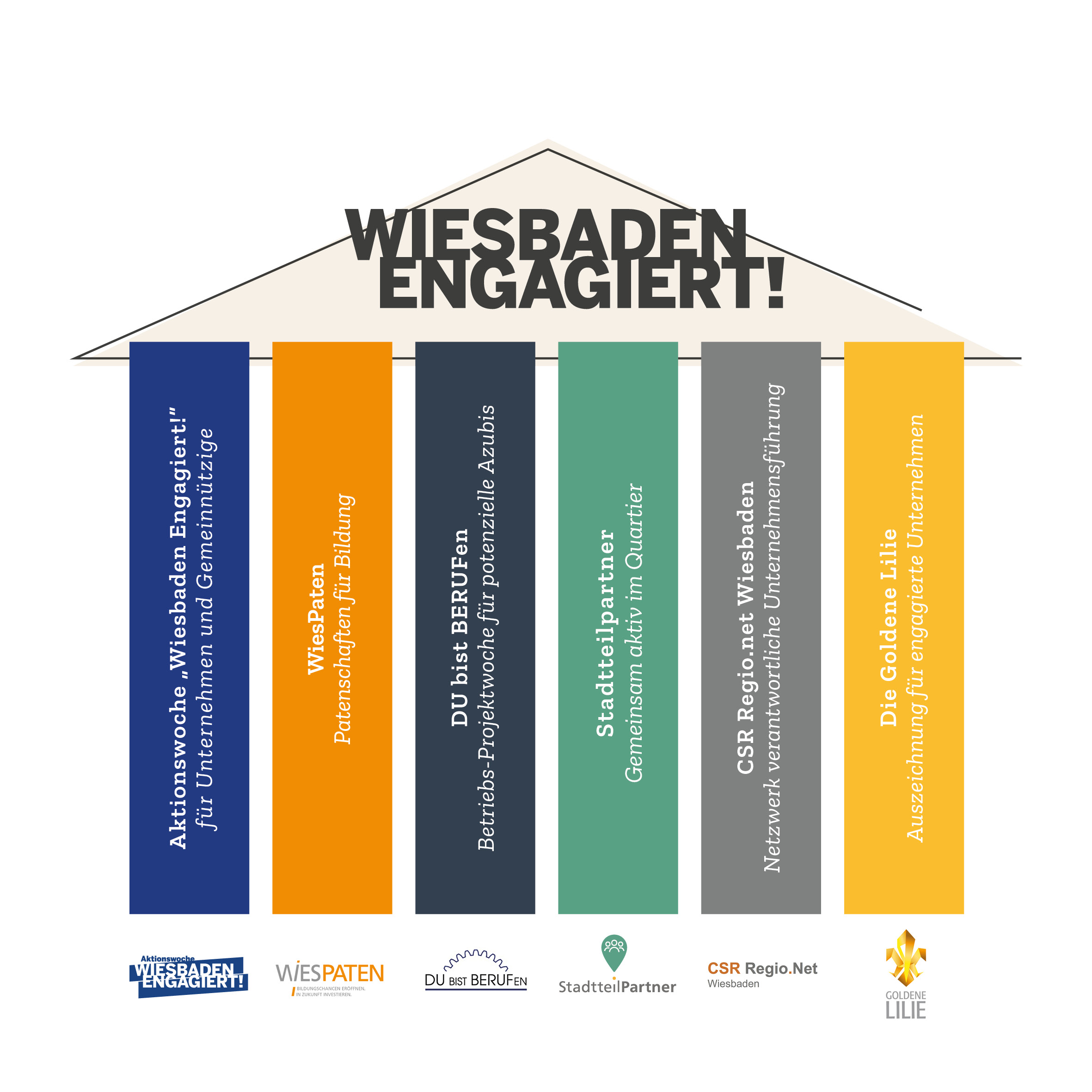 »Wiesbaden Engagiert!« steht für 6 Programme der Landeshauptstadt Wiesbaden, in denen Unternehmen sich als starke Partner für das Gemeinwesen engagieren, sich vernetzen und ihr Engagement sichtbar machen.